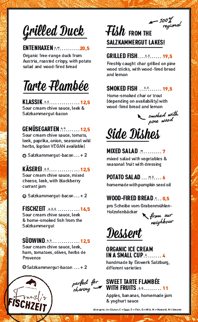 Regionality is very important to us and that is why our fish only comes from the Salzkammergut region. The crispy organic duck is sourced from Austrian farmers and the Flammkuchen are freshly topped with the best ingredients (seasonal) and herbs from our garden. Every Friday in July and August, we serve you our Burger Creations on homemade buns and special drinks in a cosy atmosphere.