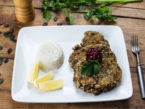 Die Brösel-Kürbiskern-Mischung, die verrührten Eier und das Mehl jeweils extra in tiefe Teller füllen. Die Lammschnitzel zwischen zwei Lagen Klarsichtfolie flach klopfen und mit Salz würzen. Eines nach dem anderen im Mehl wenden, dabei überschüssiges Mehl abklopfen. Durch die Eier ziehen und zum Schluss noch in den Bröseln wenden.
