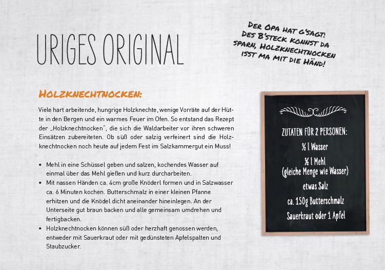 Holzknechtnocken können süß (z.B.: mit gedünsteten Apfelspalten oder Apfelmus) oder herzhaft (mit Sauerkraut) genossen werden.